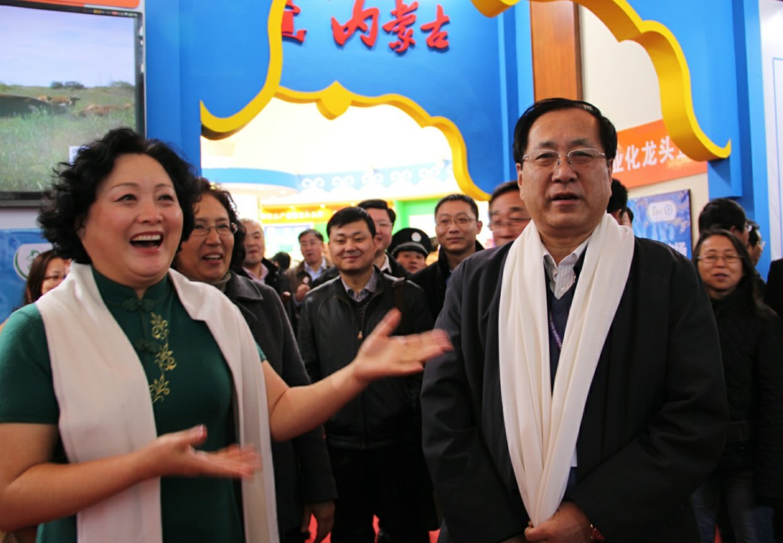 蒙元牧業(yè)董事長(zhǎng)哈斯寶魯為王玉明副主席和郭健廳長(zhǎng)介紹參展產(chǎn)品