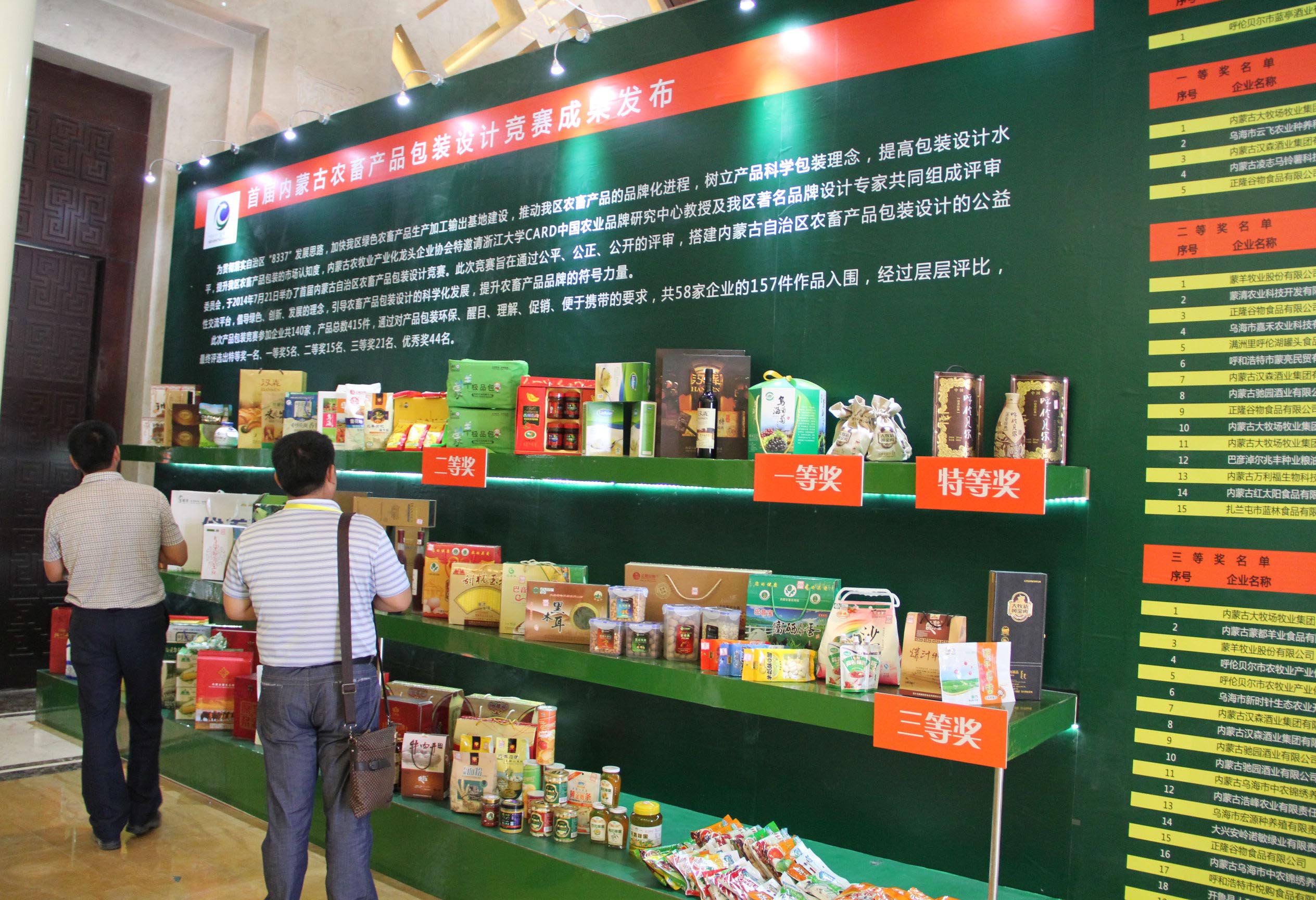 本次綠博會的最大亮點在于由農(nóng)牧業(yè)廳授權(quán),在中國·內(nèi)蒙古綠色農(nóng)畜產(chǎn)品博覽會組委會的大力支持下,協(xié)會認(rèn)定的2014(第二屆)內(nèi)蒙古“名優(yōu)特”農(nóng)畜產(chǎn)品名單和首屆內(nèi)蒙古農(nóng)畜產(chǎn)品包裝設(shè)計競賽獲獎產(chǎn)品在綠博會上展出。此次共有76家企業(yè)生產(chǎn)的143個產(chǎn)品被認(rèn)定為內(nèi)蒙古“名優(yōu)特”產(chǎn)品,共有86件產(chǎn)品在包裝設(shè)計大賽中獲獎,其中特等獎1名、一等獎5名、二等獎15名、三等獎21名、優(yōu)秀獎44名。