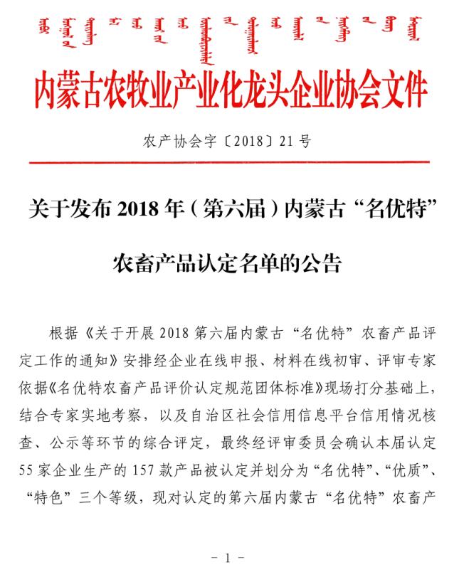 標題:關(guān)于發(fā)布2018年(第六屆)內(nèi)蒙古“名優(yōu)特”農(nóng)畜產(chǎn)品認定名單的公告