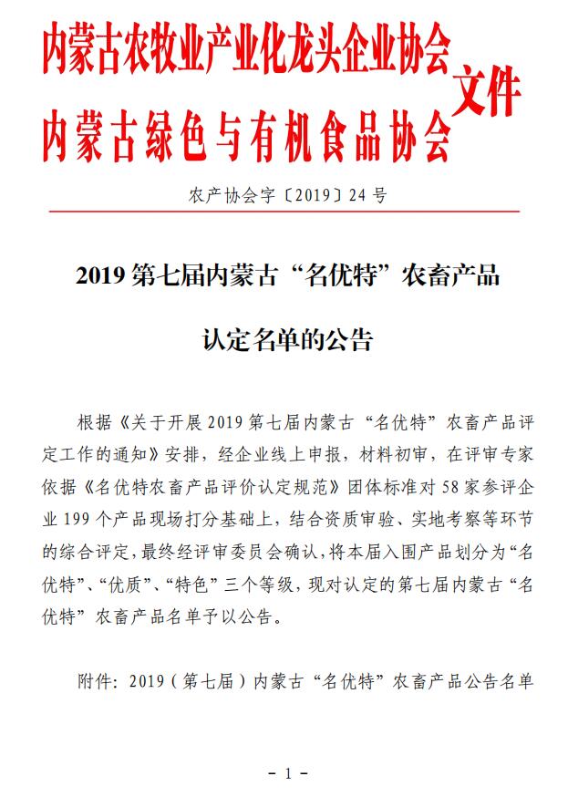 2019年(第七屆)內蒙古“名優(yōu)特”農畜產品認定公告名單