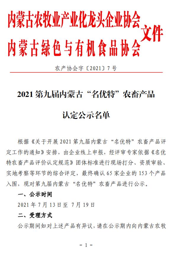 標(biāo)題:2021第九屆內(nèi)蒙古“名優(yōu)特”農(nóng)畜產(chǎn)品認(rèn)定公示名單