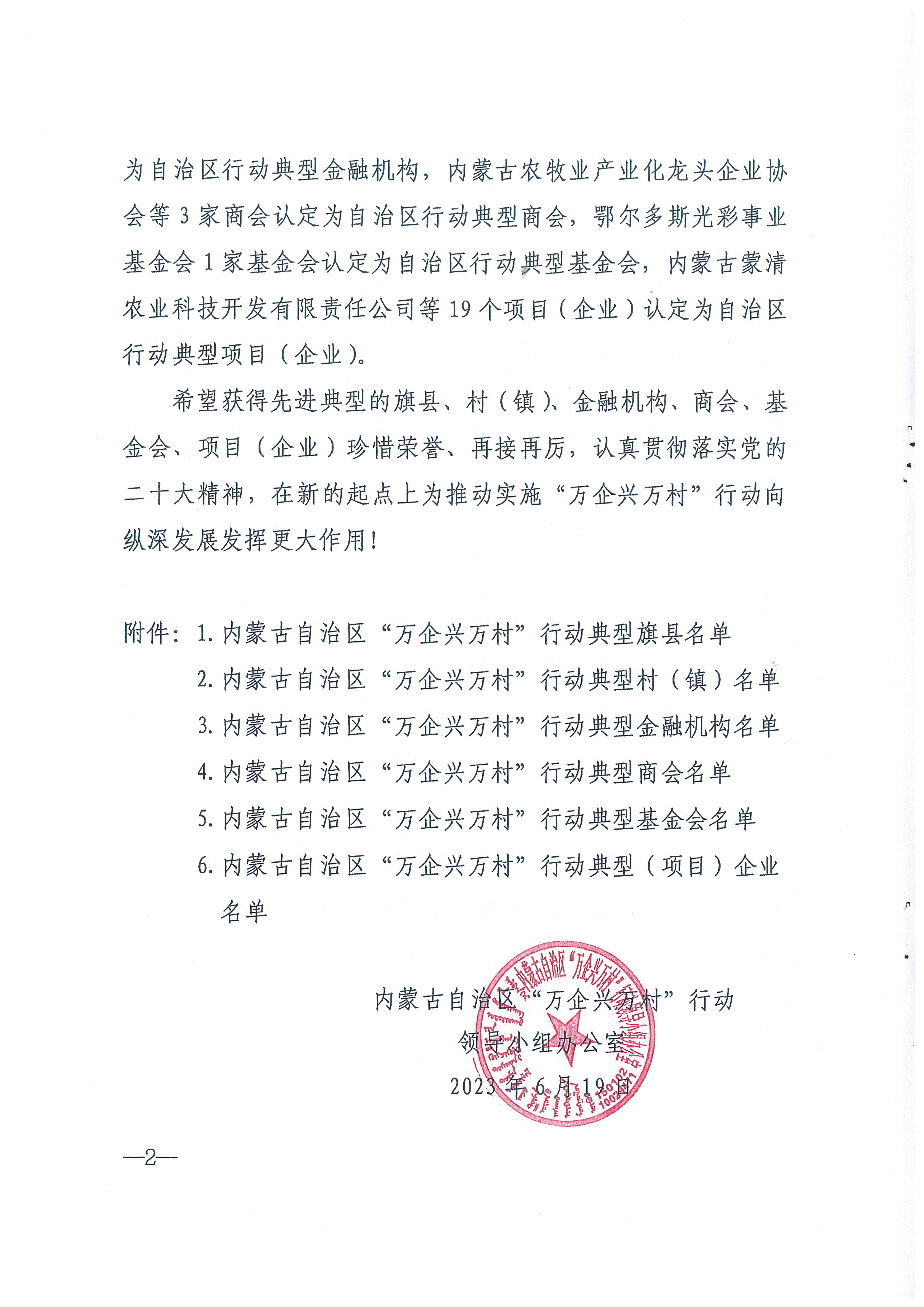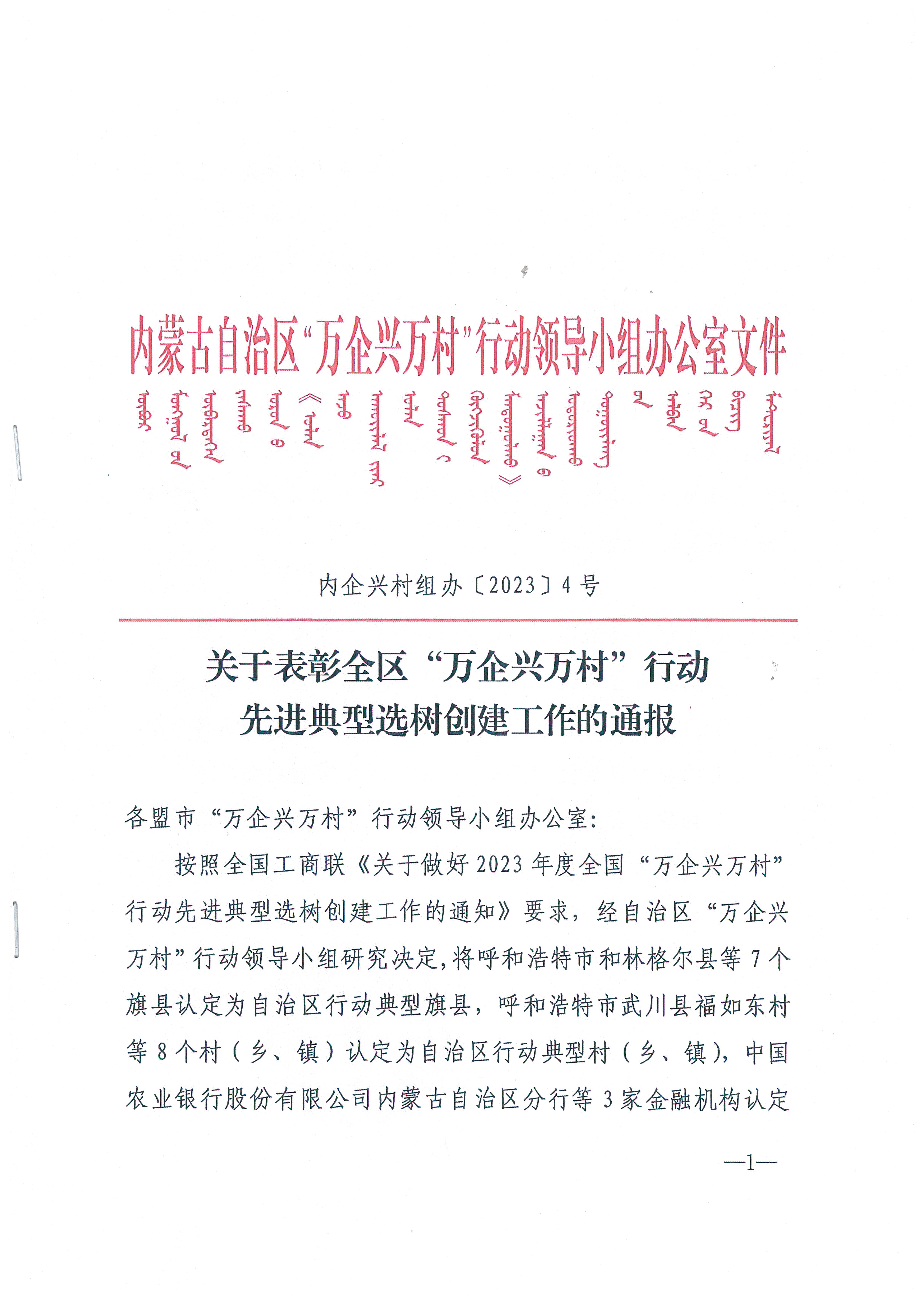 按照全國工商聯(lián)《關(guān)于做好 2023 年度全國“萬企興萬村行動先進(jìn)典型選樹創(chuàng)建工作的通知》要求,經(jīng)自治區(qū)“萬企興萬村”行動領(lǐng)導(dǎo)小組研究決定,將呼和浩特市和林格爾縣等 7個旗縣認(rèn)定為自治區(qū)行動典型旗縣,呼和浩特市武川縣福如東村等8個村(鄉(xiāng)、鎮(zhèn))認(rèn)定為自治區(qū)行動典型村 (鄉(xiāng)、鎮(zhèn)),中國農(nóng)業(yè)銀行股份有限公司內(nèi)蒙古自治區(qū)分行等 3 家金融機構(gòu)認(rèn)定為自治區(qū)行動典型金融機構(gòu),內(nèi)蒙古農(nóng)牧業(yè)產(chǎn)業(yè)化龍頭企業(yè)協(xié)會等 3 家商會認(rèn)定為自治區(qū)行動典型商會,鄂爾多斯光彩事業(yè)基金會 1家基金會認(rèn)定為自治區(qū)行動典型基金會,內(nèi)蒙古蒙清農(nóng)業(yè)科技開發(fā)有限責(zé)任公司等 19 個項目(企業(yè))認(rèn)定為自治區(qū)行動典型項目(企業(yè))。