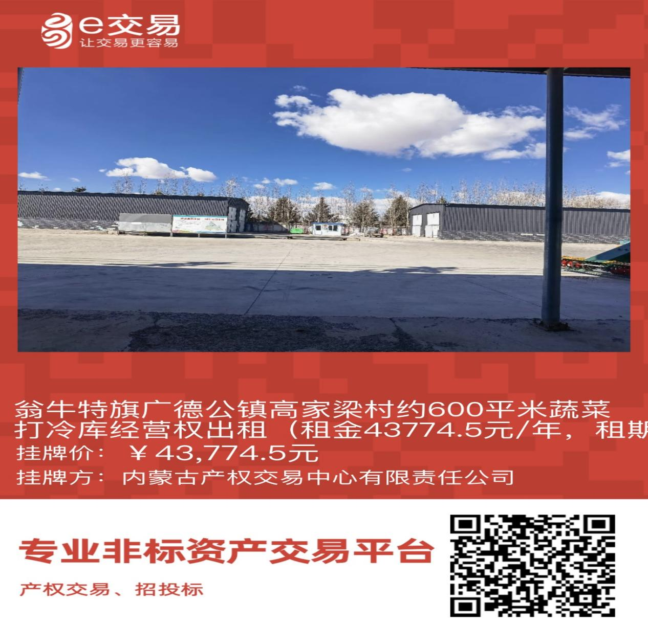 翁牛特旗廣德公鎮(zhèn)高家梁村約600平米蔬菜打冷庫經(jīng)營權(quán)出租(租金43774.5元/年,租期5年)