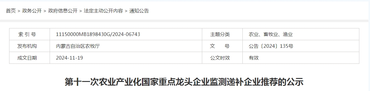 根據(jù)《農(nóng)業(yè)農(nóng)村部辦公廳關(guān)于開(kāi)展農(nóng)業(yè)產(chǎn)業(yè)化國(guó)家重點(diǎn)龍頭企業(yè)企業(yè)監(jiān)測(cè)工作的通知》(農(nóng)辦產(chǎn)〔2024〕6號(hào))和《農(nóng)業(yè)產(chǎn)業(yè)化國(guó)家重點(diǎn)龍頭企業(yè)認(rèn)定和運(yùn)行監(jiān)測(cè)管理辦法》(農(nóng)經(jīng)發(fā)〔2018〕1號(hào))規(guī)定,立足我區(qū)農(nóng)牧業(yè)產(chǎn)業(yè)發(fā)展實(shí)際,我區(qū)開(kāi)展了第十一次農(nóng)業(yè)產(chǎn)業(yè)化國(guó)家重點(diǎn)龍頭企業(yè)監(jiān)測(cè)審核和遞補(bǔ)推薦工作。經(jīng)第三方機(jī)構(gòu)審核、專家評(píng)審、相關(guān)九部門單位會(huì)議審查,擬推薦呼倫貝爾農(nóng)墾集團(tuán)有限公司、巴彥淖爾市圣牧高科生態(tài)草業(yè)有限公司、內(nèi)蒙古騎士乳業(yè)集團(tuán)股份有限公司、莫力達(dá)瓦達(dá)斡爾族自治旗沃豐生物質(zhì)新材料有限公司、內(nèi)蒙古阜豐生物科技有限公司5家企業(yè)遞補(bǔ)農(nóng)業(yè)產(chǎn)業(yè)化國(guó)家重點(diǎn)龍頭企業(yè)。