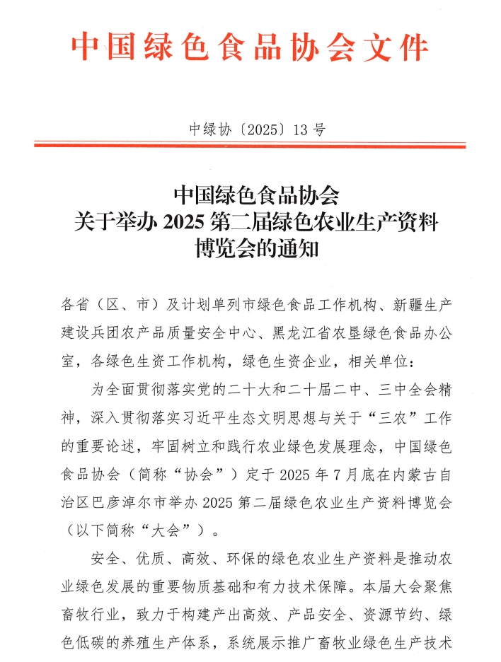 中國綠色食品協(xié)會關(guān)于舉辦2025第二屆綠色農(nóng)業(yè)生產(chǎn)資料博覽會的通知
