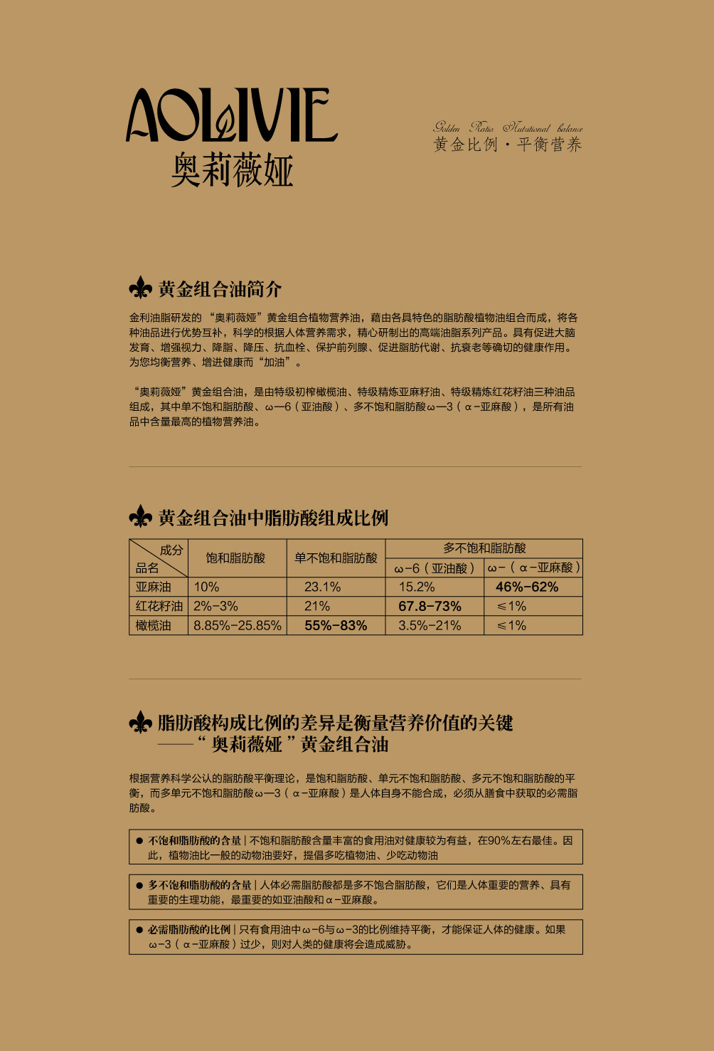 金利油脂(蘇州)有限公司研發(fā)的:“奧莉薇婭黃金組合植物營養(yǎng)油,有各具特色的脂肪酸植物油組合而成,將各種油品進(jìn)行優(yōu)勢互補(bǔ),科學(xué)的根據(jù)人體營養(yǎng)需求,精心研制出的高端油脂系列產(chǎn)品。具有促進(jìn)大腦發(fā)育/增強(qiáng)視力/降脂/降血壓/抗血栓/保護(hù)前列腺/促進(jìn)脂肪代謝/抗衰老等良好的保健作用。為您均衡營養(yǎng)/增強(qiáng)體質(zhì)而“加油”。“奧莉薇婭黃金組合油,是有特級(jí)初榨橄欖油/特級(jí)冷榨亞麻籽油/特級(jí)精煉紅花籽油三種油品組成,其中單不飽和脂肪酸/α—亞麻酸和亞油酸,是所有植物油中含量最高植物營養(yǎng)油。
