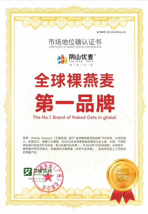 2025年7月,內(nèi)蒙古陰山優(yōu)麥?zhǔn)称酚邢薰精@得權(quán)威咨詢機(jī)構(gòu)艾媒咨詢(iiMedia Research)頒發(fā)的“全球裸燕麥第一品牌”與“中國(guó)國(guó)產(chǎn)燕麥第一品牌”市場(chǎng)地位確認(rèn)證書。同時(shí),其創(chuàng)新產(chǎn)品“低GI五黑燕麥片”亦被權(quán)威認(rèn)證為全球開創(chuàng)者,標(biāo)志著陰山優(yōu)麥在全球燕麥行業(yè)取得突破性成果。